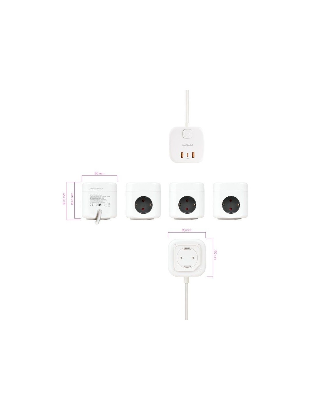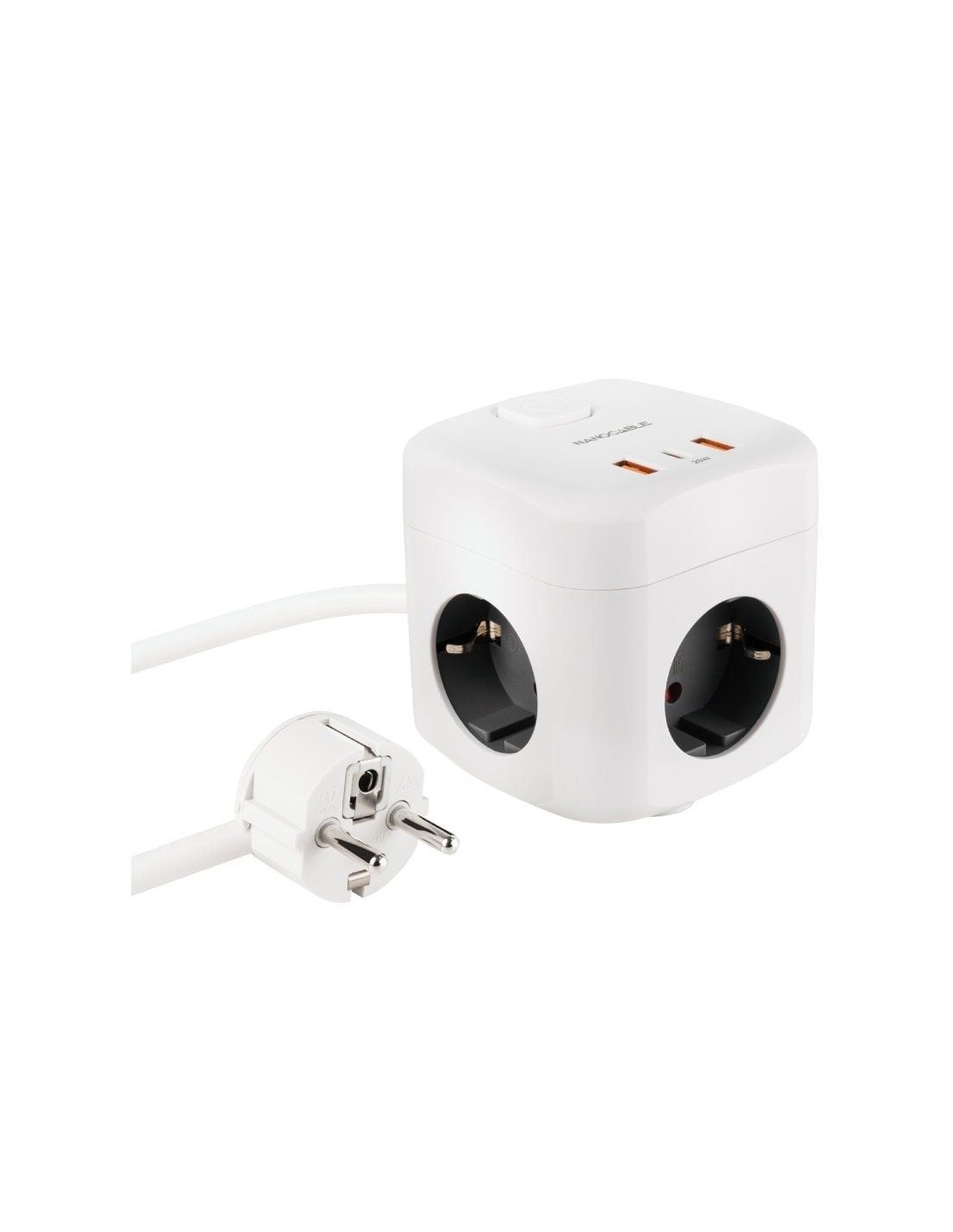 Regleta compacta en formato cubo con 3 enchufes de 16A y 3 puertos USB (2x USB-A + 1x USB-C).