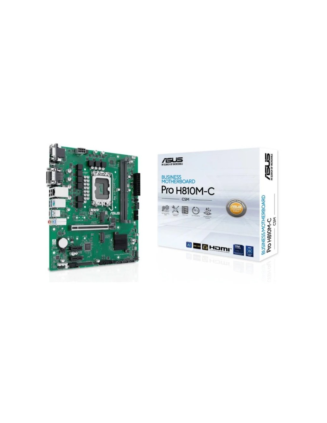 La Placa Base ASUS Pro H810M-C-CSM está diseñada para satisfacer las necesidades de entornos profesionales que demandan alta estabilidad y rendimiento, destacando por su fiabilidad, características comerciales avanzadas y diseño robusto. Como parte de la serie CSM (Corporate Stable Model), ofrece garantías de soporte extendido, actualizaciones específicas y una fiabilidad certificada para operaciones 24/7. Su formato micro-ATX optimiza el espacio y permite configuraciones flexibles con soporte para procesadores Intel® Core™ Ultra de 2ª serie y almacenamiento avanzado mediante múltiples ranuras M.2 y puertos SATA.